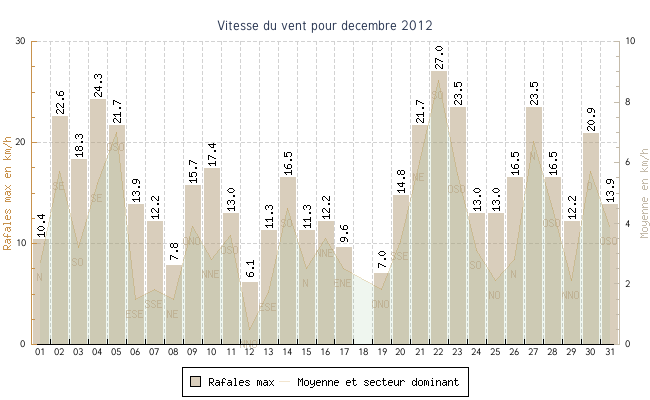 | min | max | moy | Vitesse (rafales) | Secteur | ||